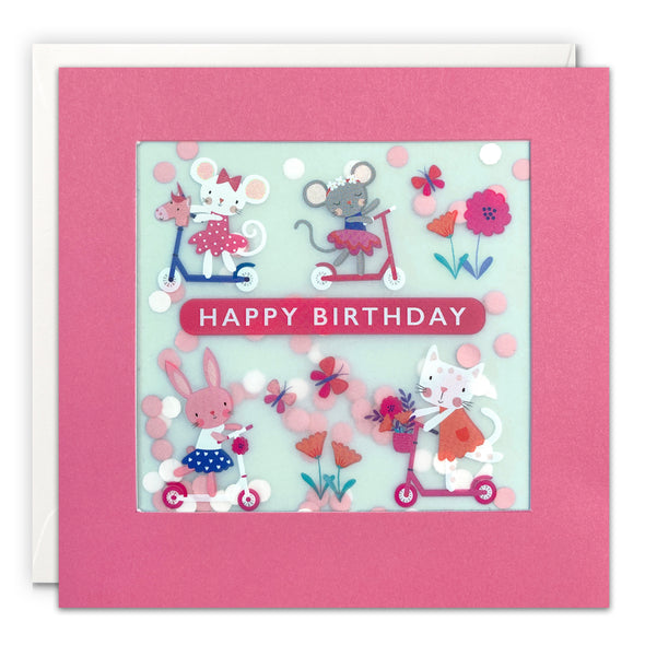 A colourful children's birthday card illustrated by Klara Hawkins. The image on the front shows mice and rabbits riding scooters, surrounded by butterflies and flowers.