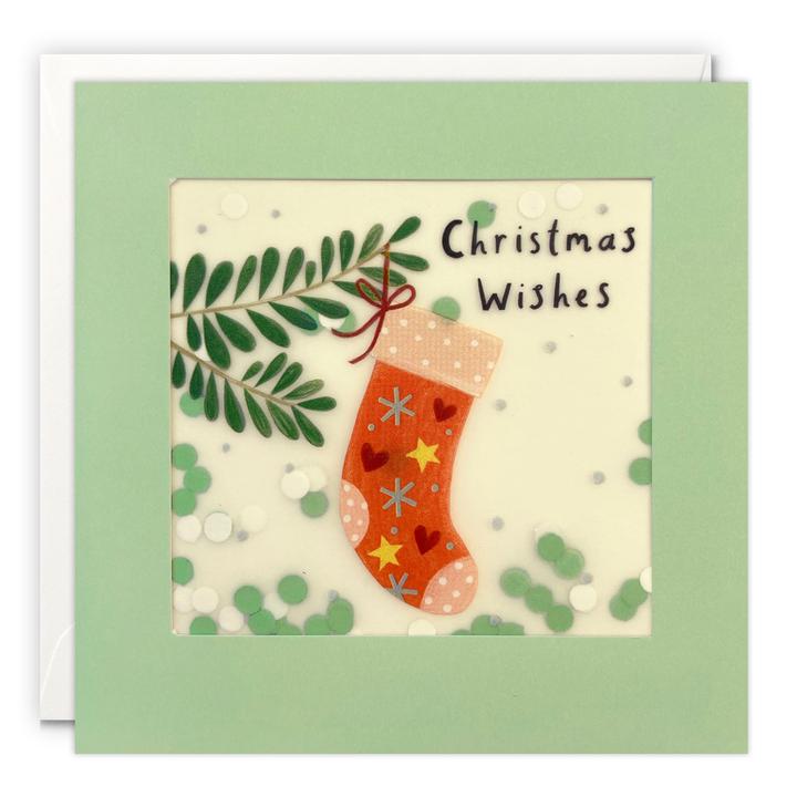 The message inside reads 'Merry Christmas and Happy New Year'. The image is printed on translucent paper, showing coloured confetti dots behind. The confetti moves around when you shake the card.