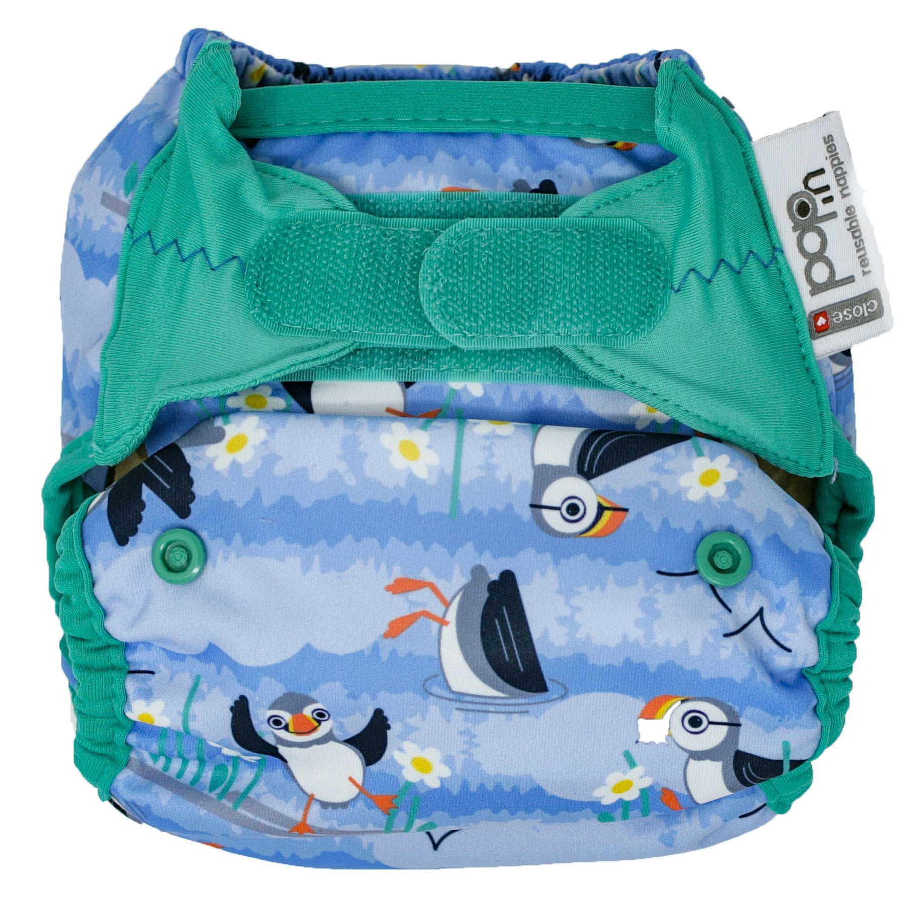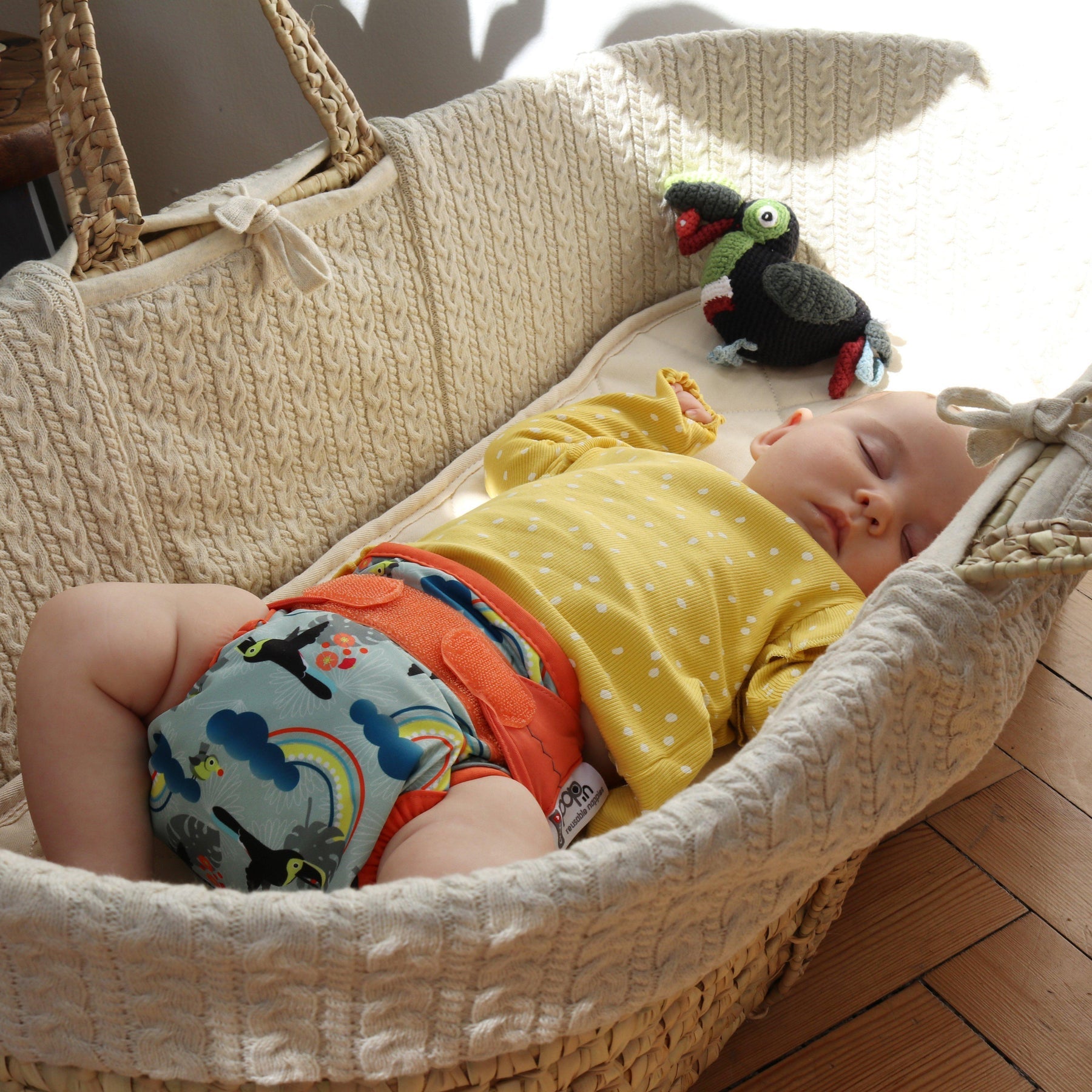 These covers are specially designed to be used over an absorbent fitted nappy or pre-fold as an alternative to an all-in-one or all-in-two system. The Pop-in nappy wraps are ideal for either day or night, thanks to their renowned leak-proof double leg gusset. They are cut generous enough to fit over even the bulkiest two-part nappy system. Our hook and loop fastening, and stretchy tabs make it easy to ensure a snug, soft fit around baby every time.