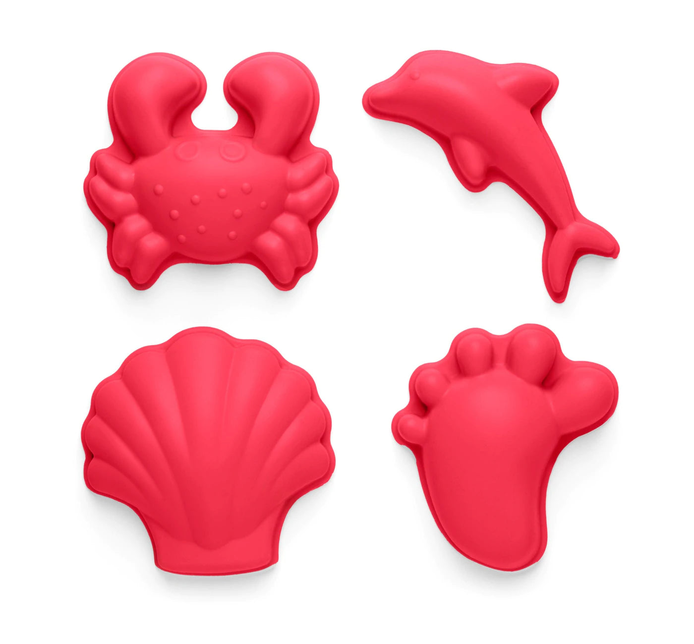 A set of 4 super soft silicone sand moulds, all wrapped up in a net bag.