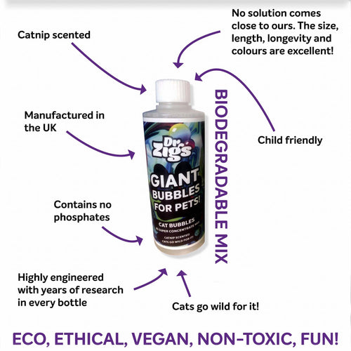 Dr Zigs Catnip-Scented Bubble mix is specially designed with your cats in mind!