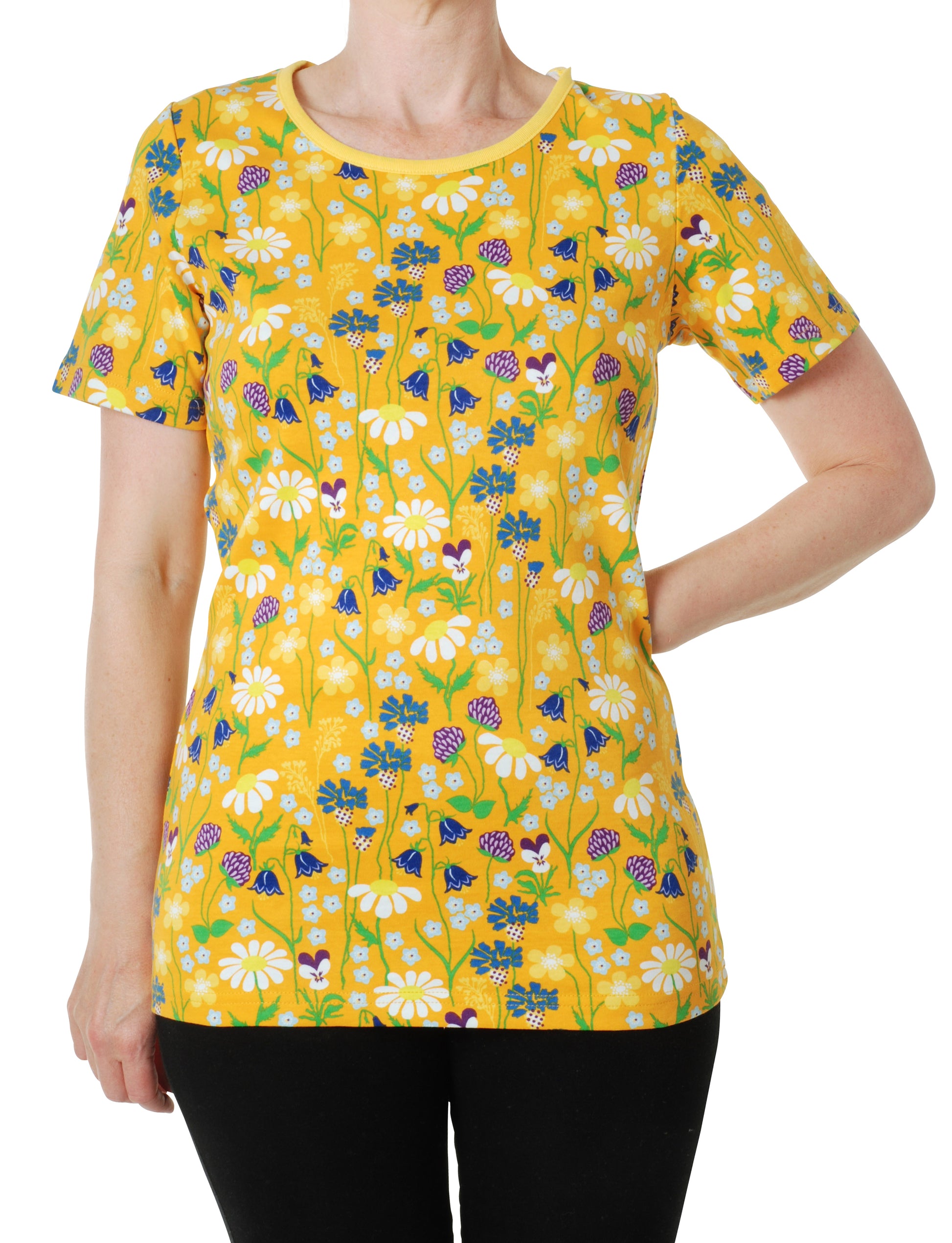 DUNS Midsummer Flowers Yellow Adult Short Sleeve Top by DUNS Sweden in GOTS certified cotton.
