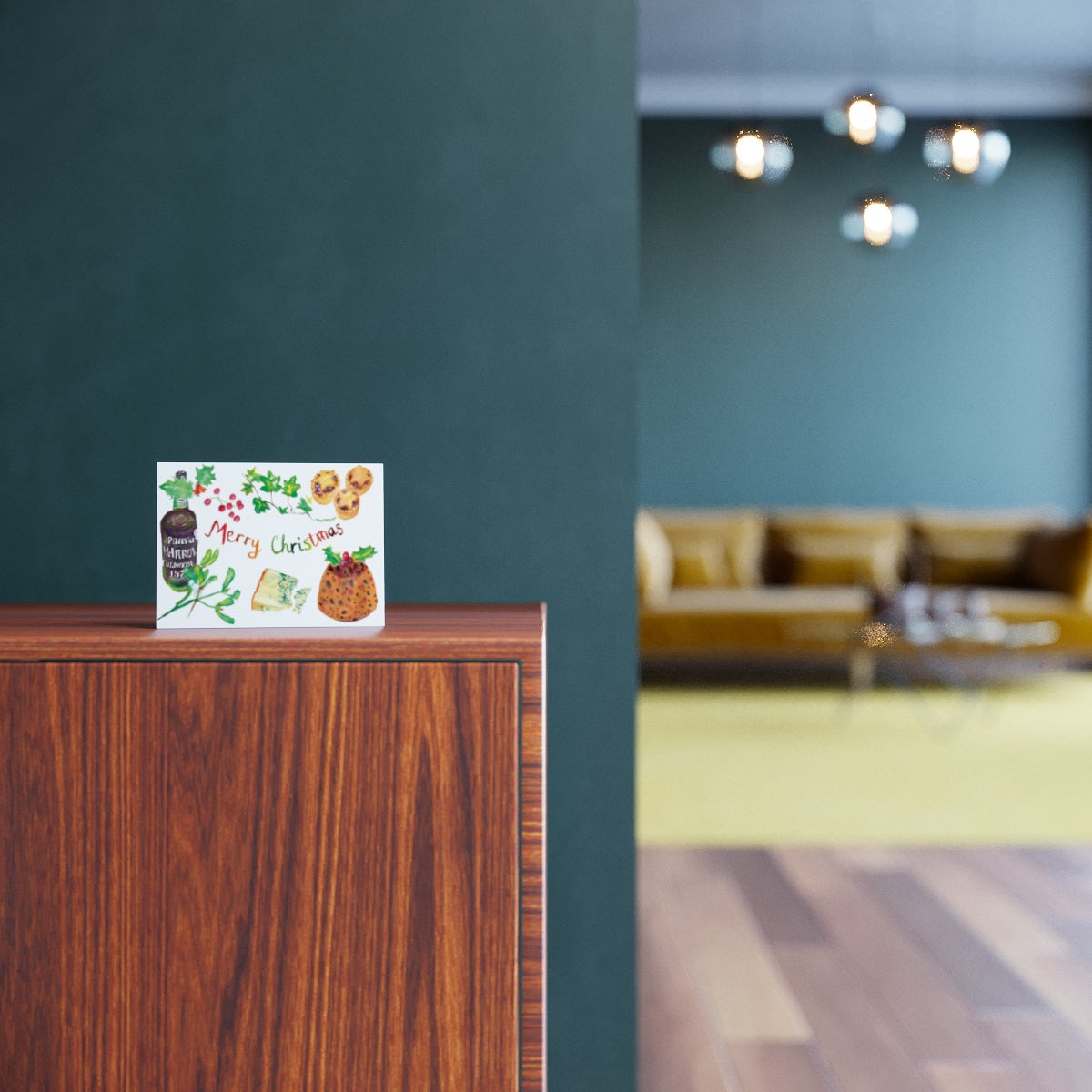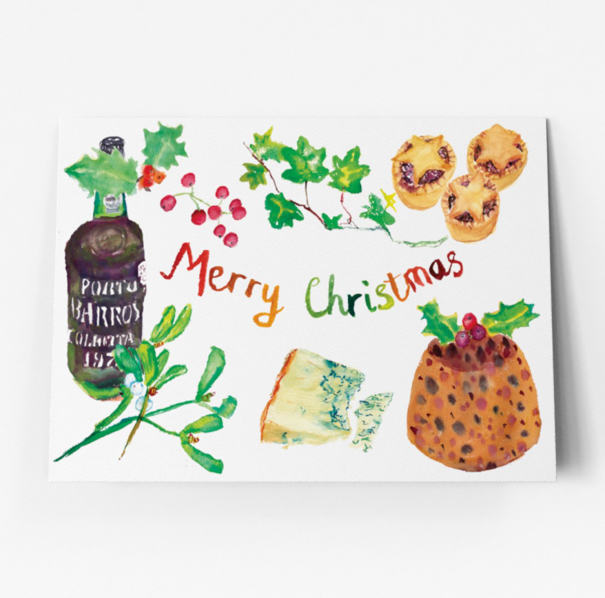 A beautiful Christmas card featuring many artistic Christmas foods, reading 'Merry Christmas'. A fantastic Christmas card for friends and family alike!