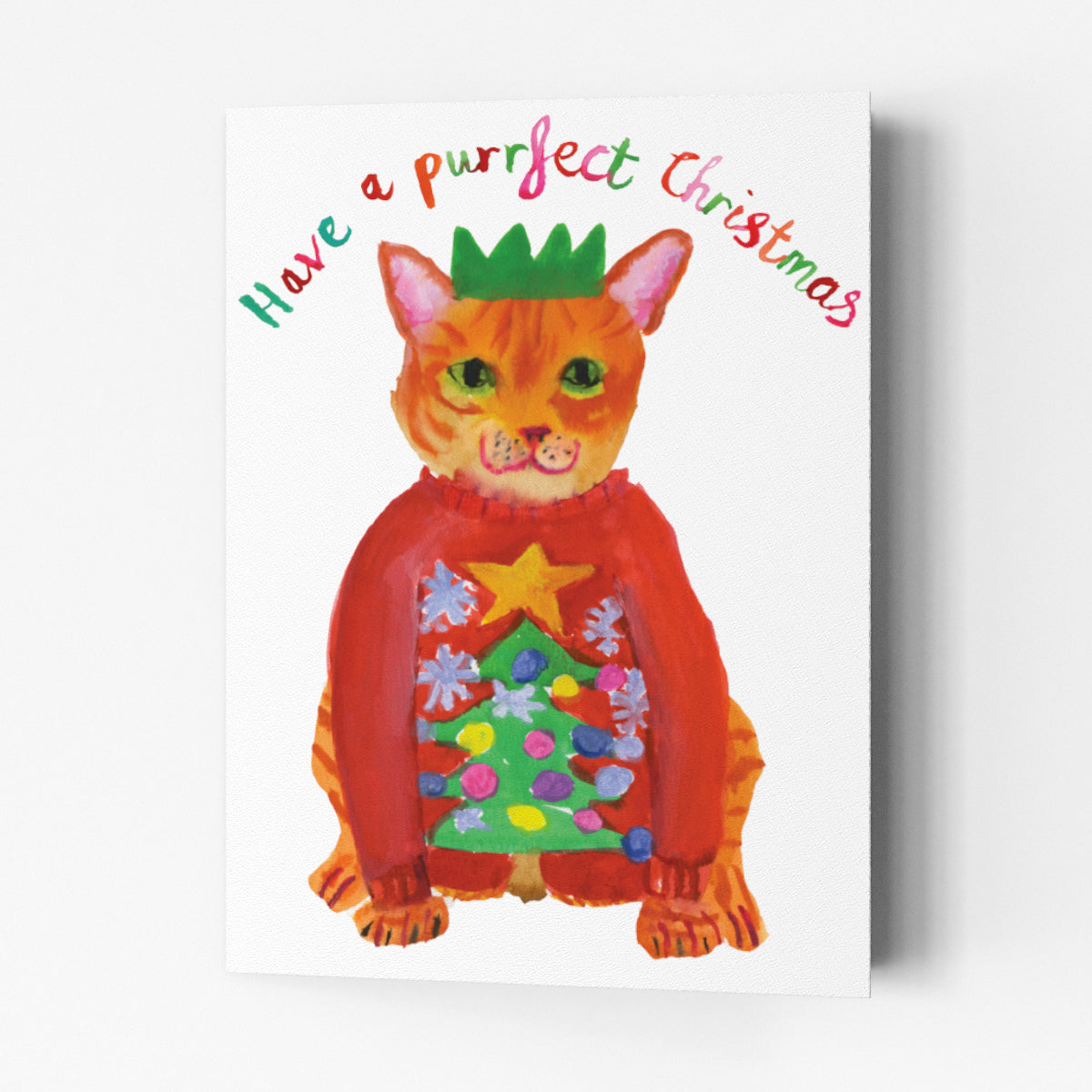 A beautiful Christmas card featuring an artistic watercolour ginger cat in a Christmas jumper and party hat, featuring the words "Have A Purrfect Christmas". A fantastic Christmas card for friends and family alike!