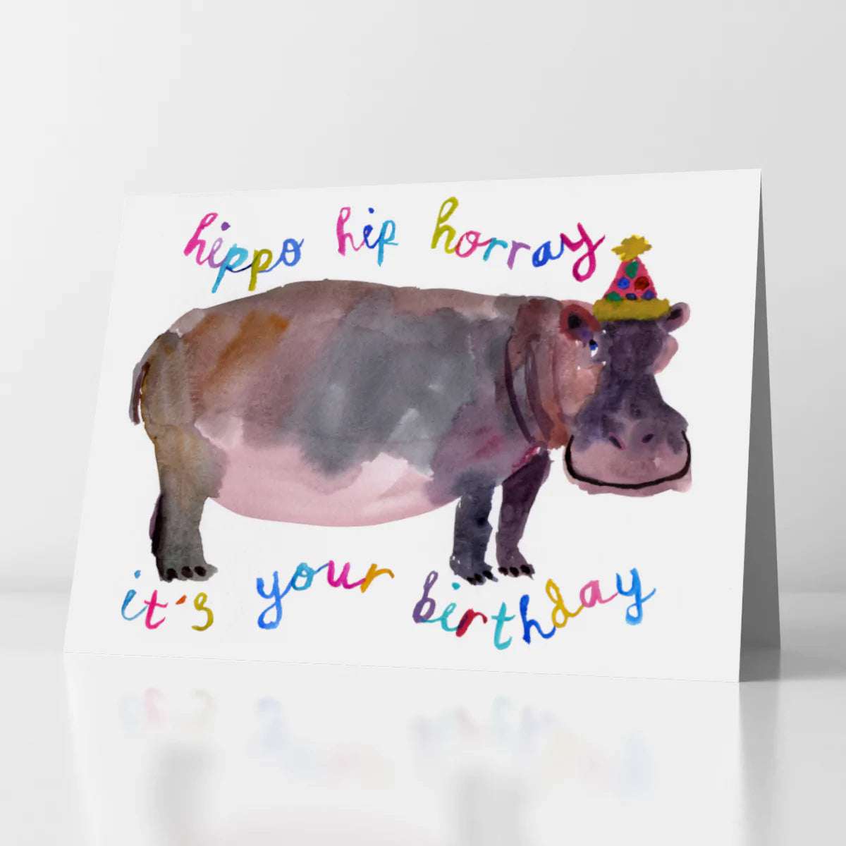 An adorable new birthday card featuring a sweet hippo celebrating and wishing you a happy birthday!