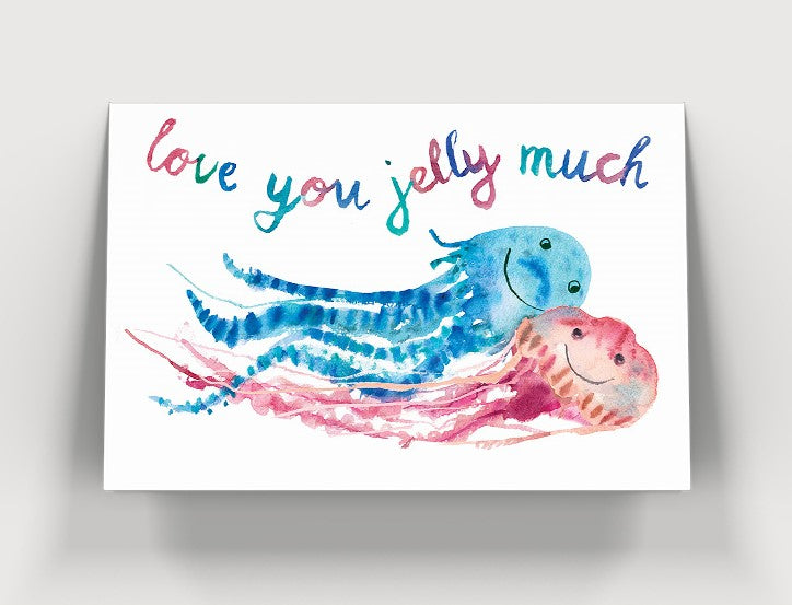 A sweet, colourful card featuring two beautifully drawn jellyfish.