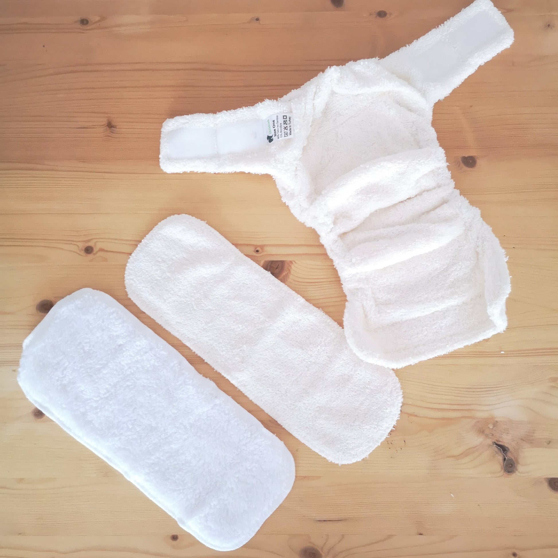 Each contains a cotton booster (Separate for size 1, attached at one end for sizes 2 & 3) and a separate fleecy liner.