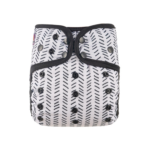 Adjust the front of the nappy using the rise snaps. This nappy is as close to a disposable as you can get - everything is sewn in, so just put the nappy on and go!