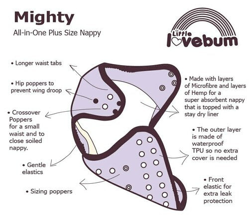 The Mighty is a super absorbent All-in-One, roomy nappy designed for bigger babies and toddlers. It has a stay-dry liner to keep your baby comfortable and dry, below this is layers of microfibre which quickly absorbs liquids down to the thirsty hemp layers below.