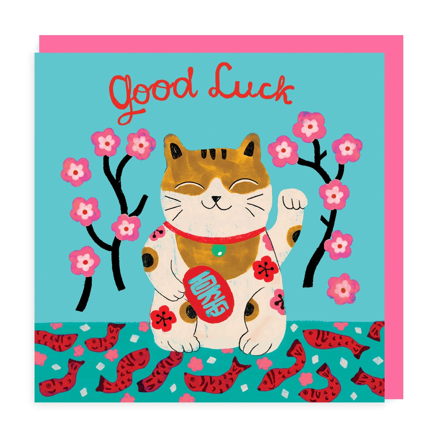 A good luck card with a Japanese maneki neko cat and cherry blossom.