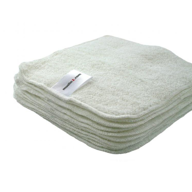 A 12 pack of Soft and Silky in White or Unbleached Bamboo Cotton Terry Wipes by Muslinz. Perfect as a washable, reusable cleaning wipe for any situation. Soft and absorbent. Can be used as a re-usable wipe for when nappy changing or as a face cloth and for general mopping up! So useful, a must have for every new baby! 50% bamboo 50% cotton 20x20cms