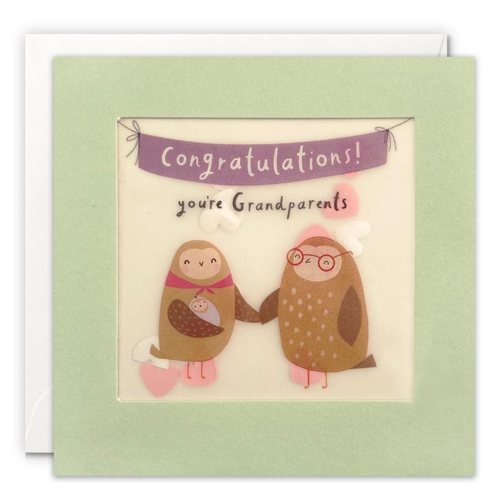 A hand finished new baby card for Grandparents, illustrated by Kate Mainard. The image on the front features an owl couple holding a new baby.