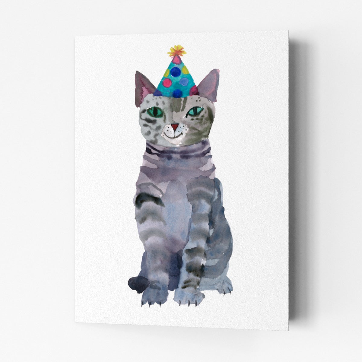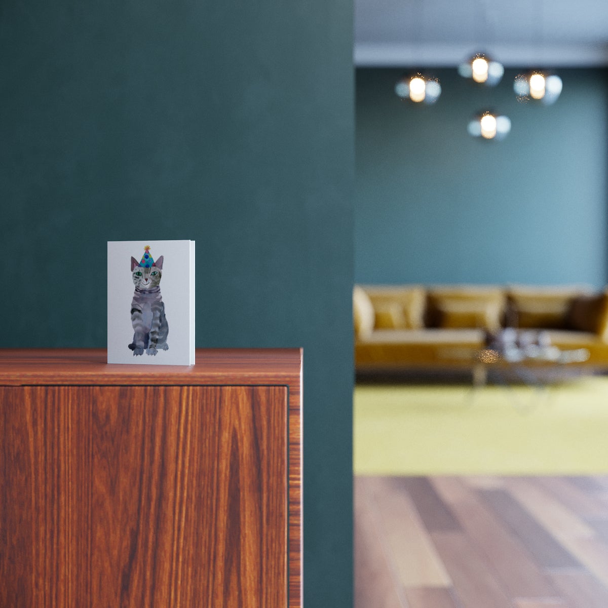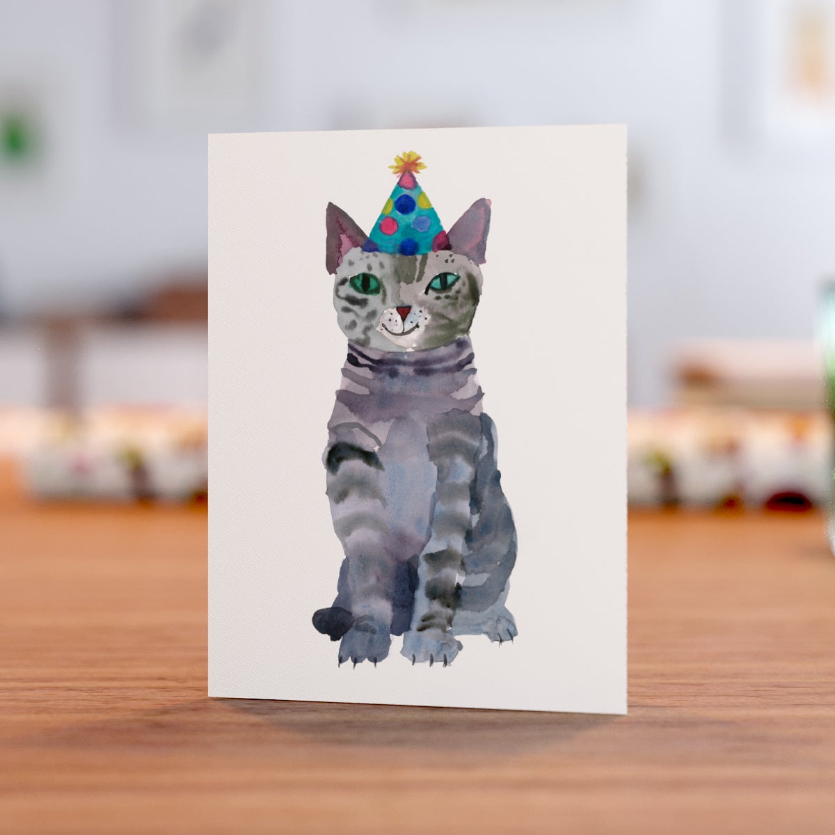 A cool cat birthday card featuring a striped grey cat wearing a party hat, left blank for any occasion!