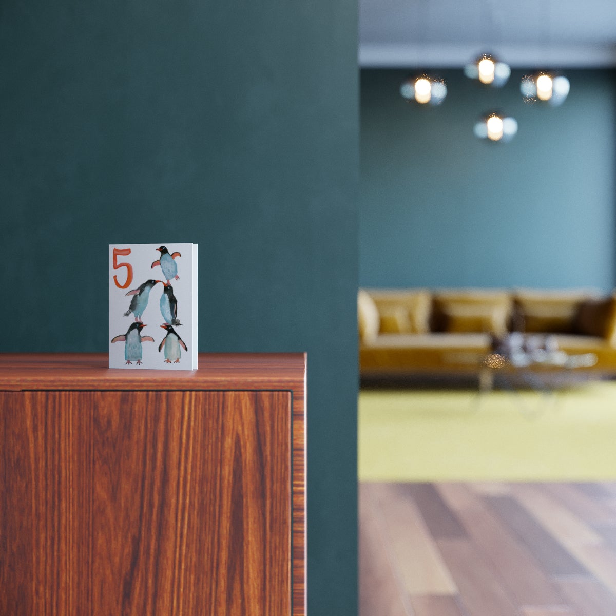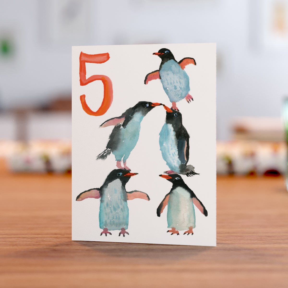 A beautiful 5th birthday card featuring five funny penguins balancing in a tower. Perfect for a little one's five years birthday celebration!