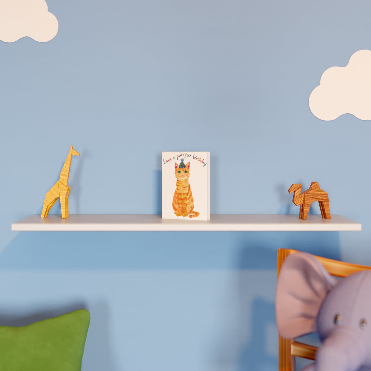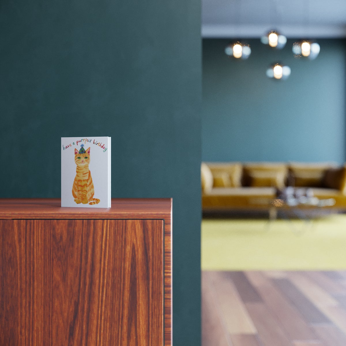 A cute cat birthday card featuring a happy cat wearing a party hat, which says "have a purrfect birthday'. Perfect for a birthday celebration for any age!
