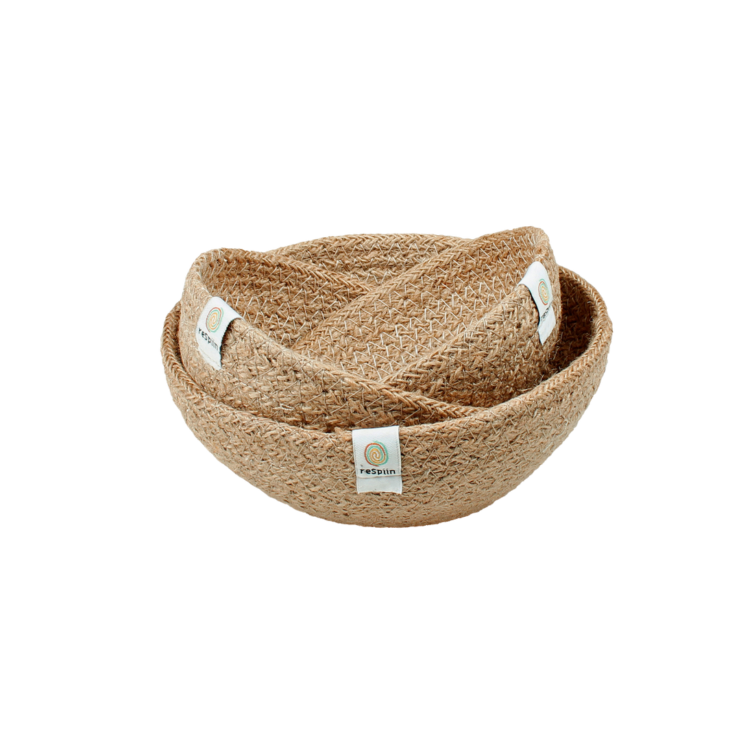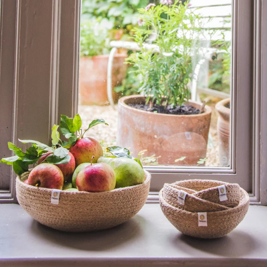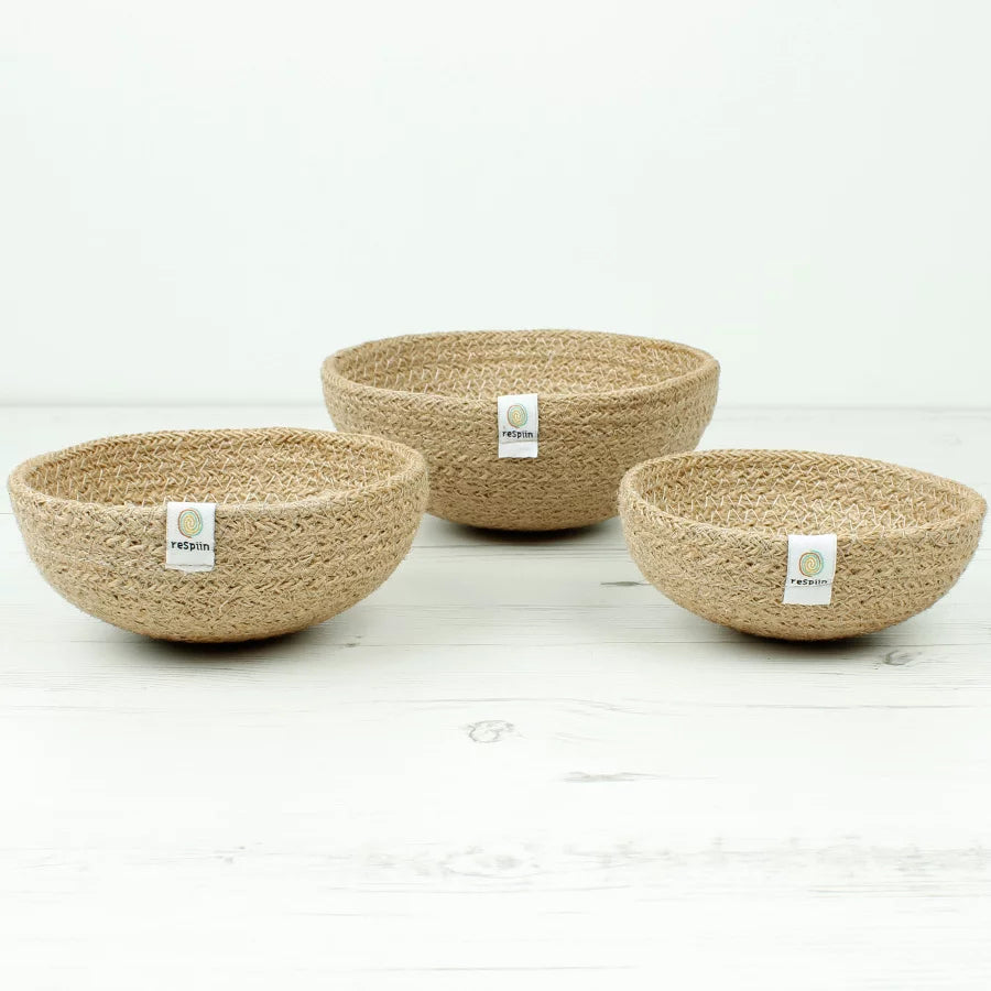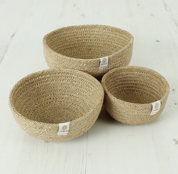 Set of 3 beautifully crafted, handmade mini bowls made from sustainable hardwearing jute, produced in Bangladesh. A great alternative to unattractive plastic storage, these gorgeous bowls can be used to store just about anything, and will look fantastic in any environment.