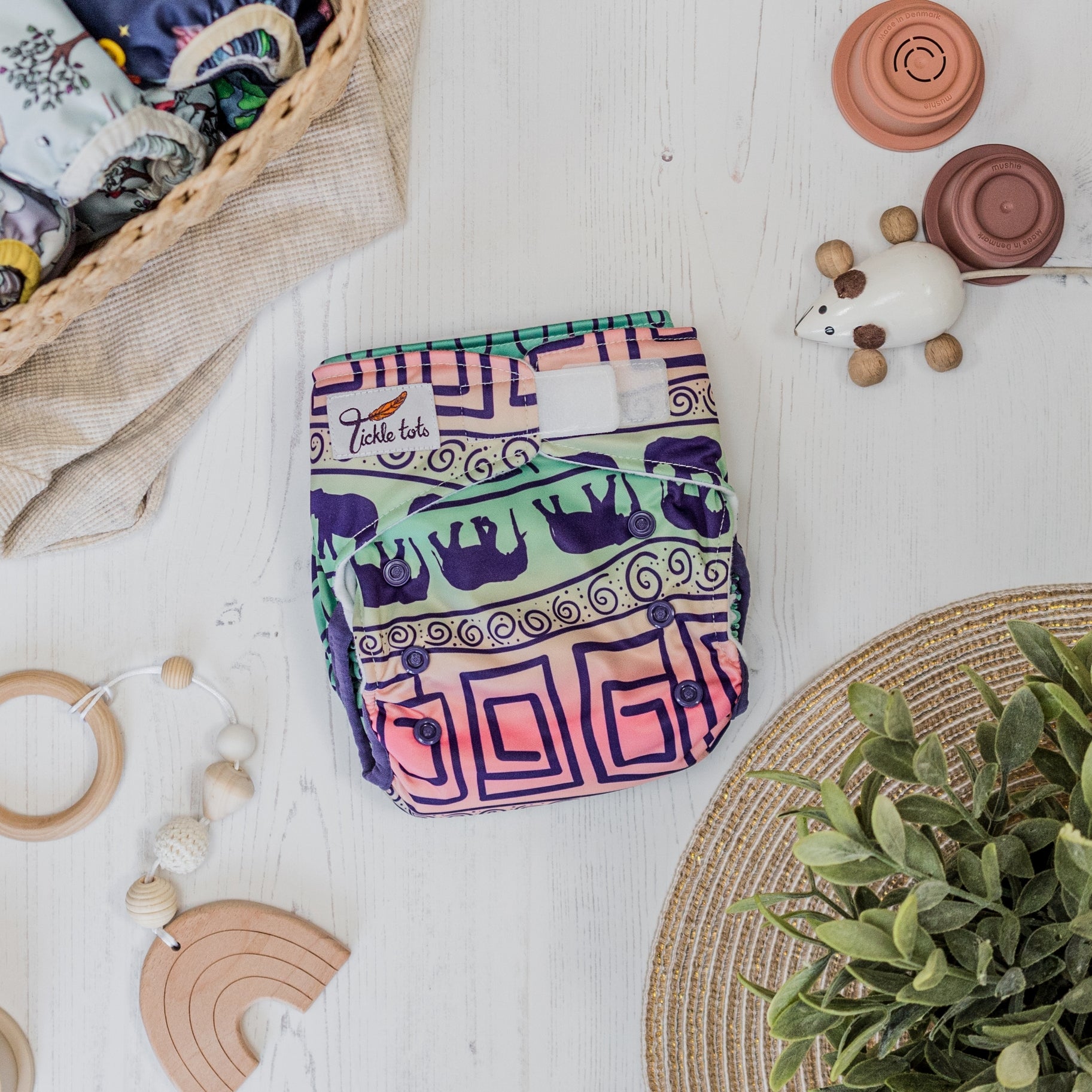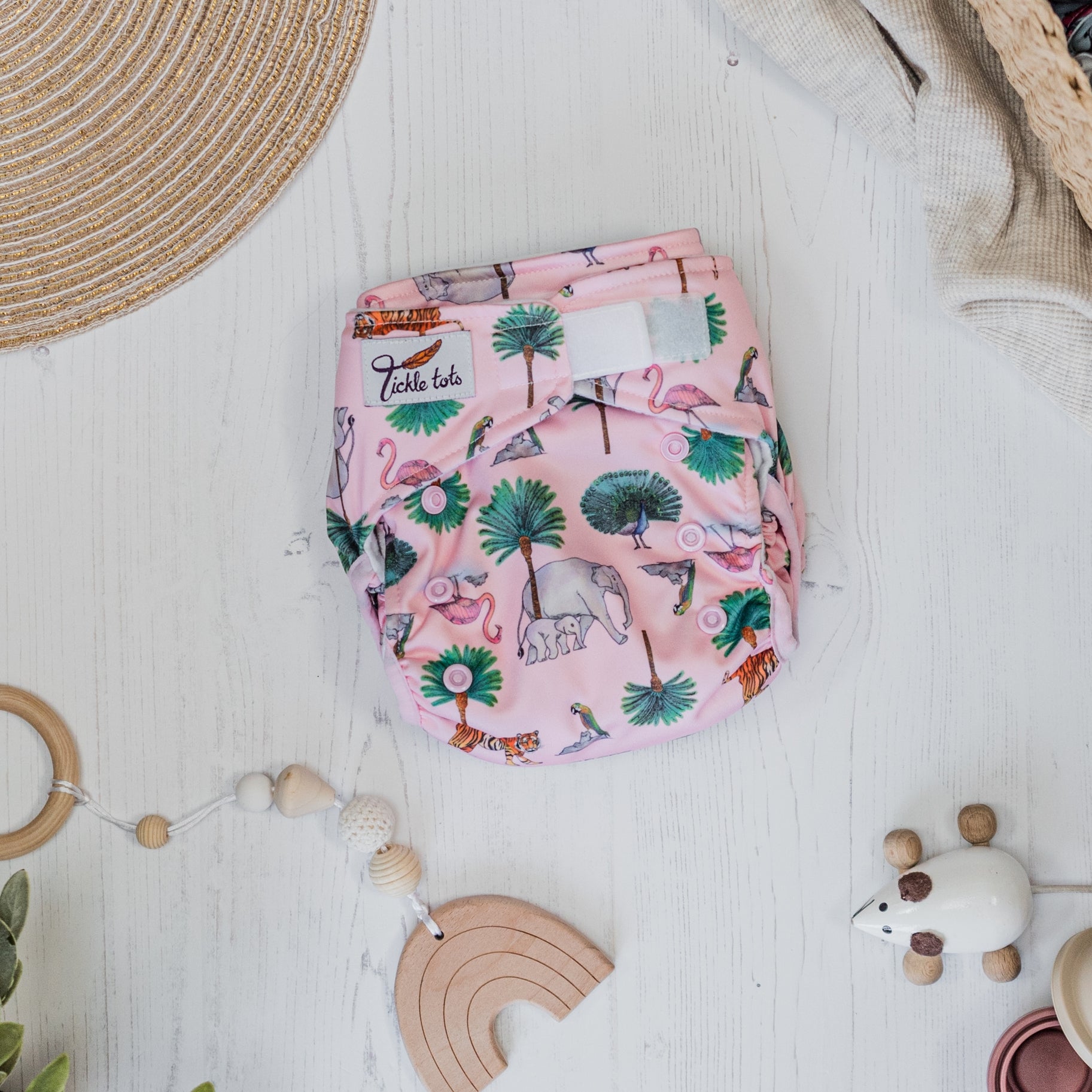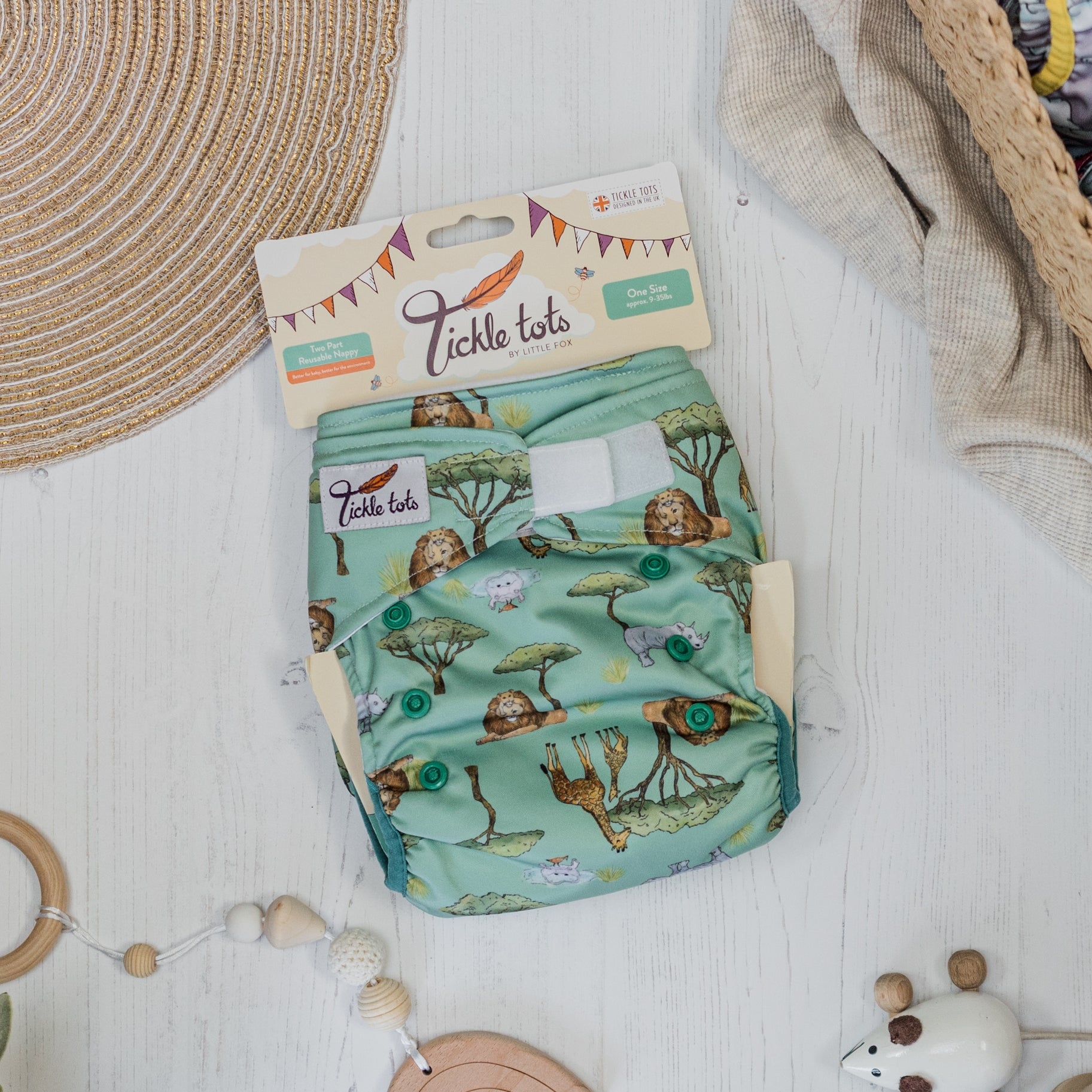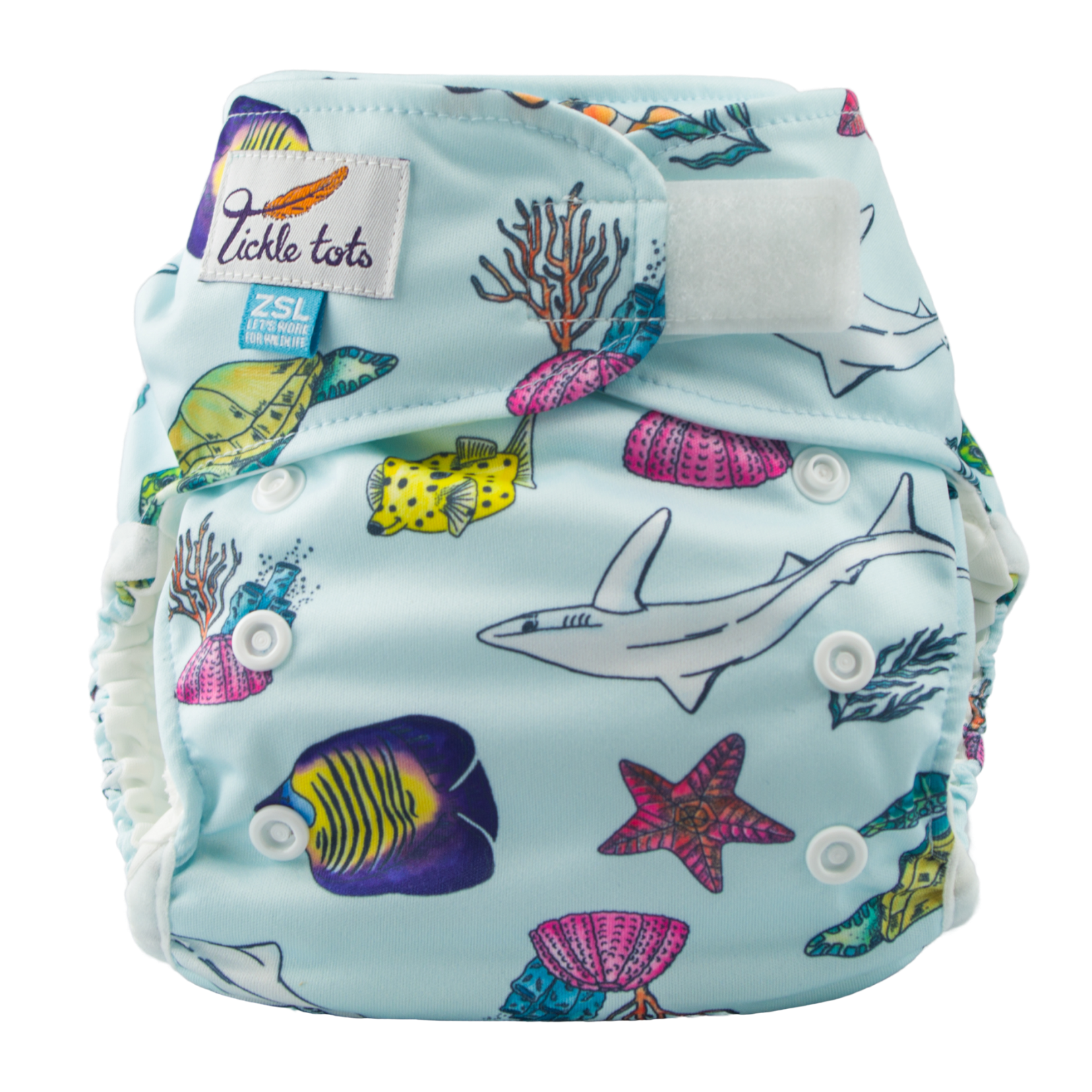 The Tickle Tots 2’s is a two-part nappy system consisting of an outer waterproof shell with ‘snap in’ absorbent boosters.