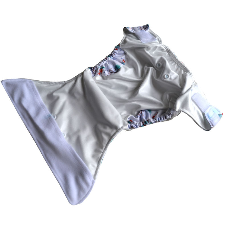 Adjust the front of the nappy using the rise snaps, then popper the inserts into the nappy, you may use just one on smaller babies for a slimmer fit, opting for two as your baby gets older. At change time, simply replace the boosters, you can reuse the nappy shell 2-3 times before washing.