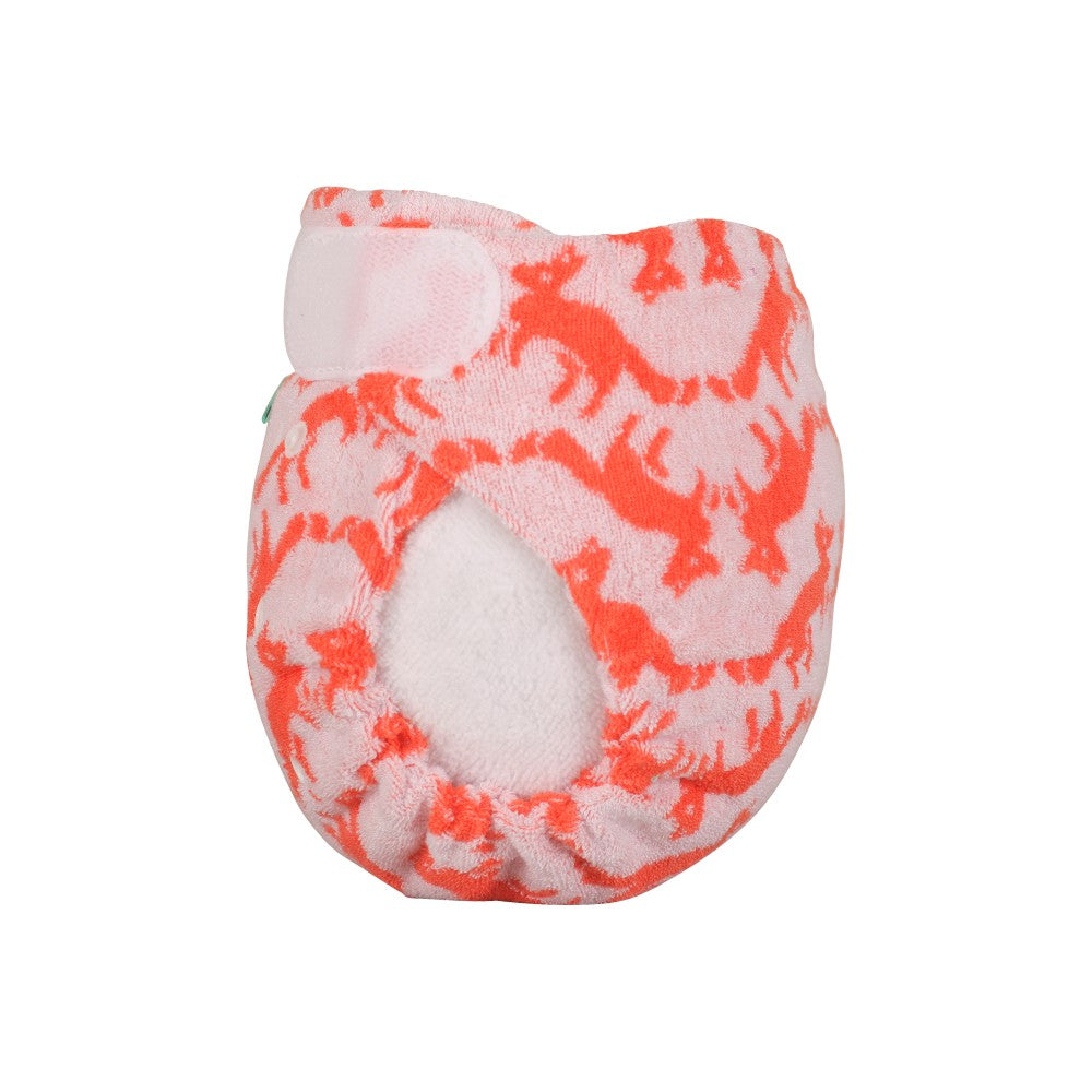 Adjust the rise poppers to fit your baby, then place the extra insert in, followed by the fleece liner which sits closest to the skin for comfort. Fasten the nappy on your baby then place a wrap over the top, ensuring none of the fitted nappy material is poking through. You can simply replace the inner fitted nappy at change time, allowing you to reuse the outer wrap a few times before it needs a wash.